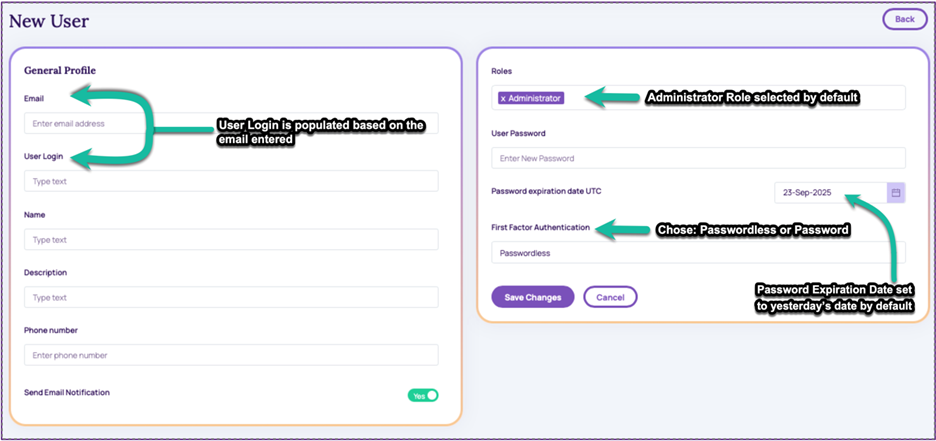 The New User creation page in Identity Portal has been updated to provide a simpler and more consistent experience. Key changes include new fields such as a default-selected “Send Email Notification” checkbox (which must be unchecked if no email is entered), a First Factor Authentication dropdown with Passwordless selected by default, a Password Expiration Date field (defaulting to yesterday’s date), and a default Administrator role.